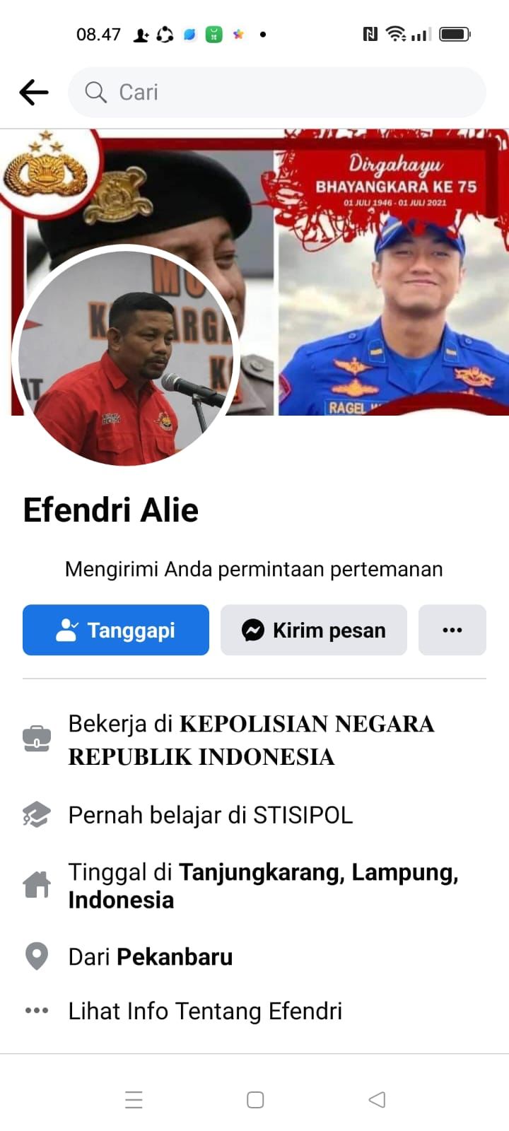Akun Facebook Palsu milik Kanit I Subdit I Ditkrimum Polda Kepri, AKP Efendri Alie yang digunakan Pelaku Penipuan.