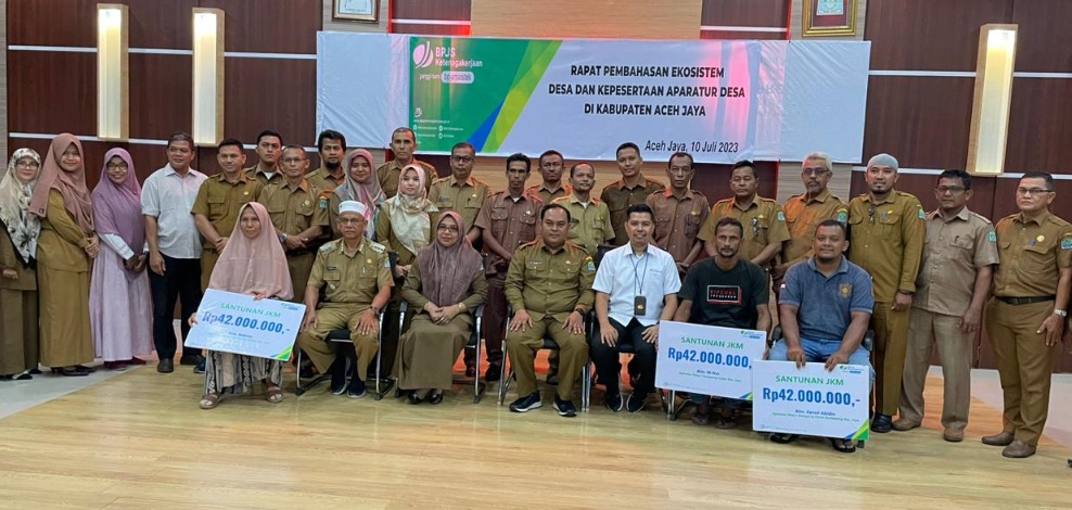 Acara ini juga menjadi kesempatan untuk melakukan penyerahan simbolis santunan JKM kepada ahli waris aparatur desa yang telah berjasa di wilayah Aceh Jaya.