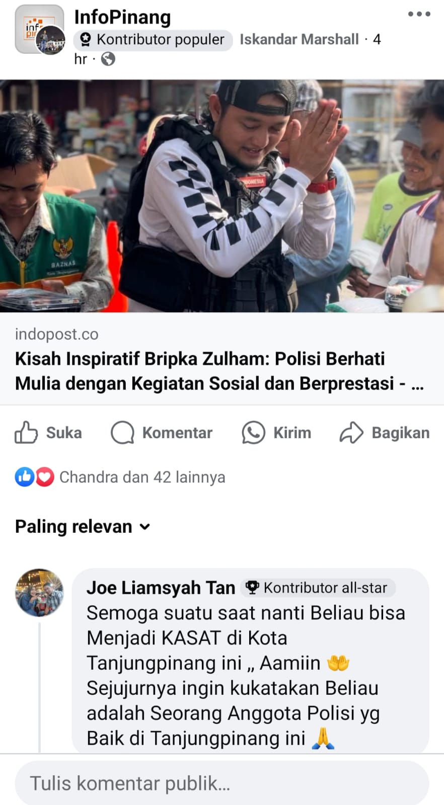 Infotoday.id – Pemberitaan tentang Bripka Zulhamsyah Putra, anggota Sat Intelkam Polresta Tanjungpinang yang menggagas program Razia Perut Lapar (RPL), sempat viral di media sosial Facebook (FB) pada Senin (30/12/2024). Berbagai komentar positif dari warganet di grup InfoPinang mewarnai pemberitaan tersebut.