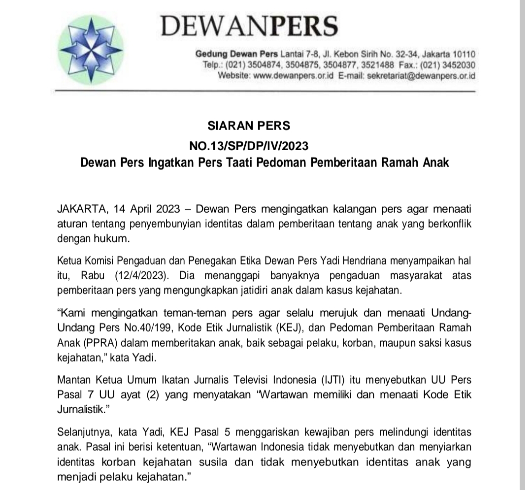 “Kami mengingatkan teman-teman pers agar selalu merujuk dan menaati UndangUndang Pers No.40/199, Kode Etik Jurnalistik (KEJ), dan Pedoman Pemberitaan Ramah Anak (PPRA) dalam memberitakan anak, baik sebagai pelaku, korban, maupun saksi kasus kejahatan,” kata Yadi melalui siaran persnya pada Jumat (14/04)