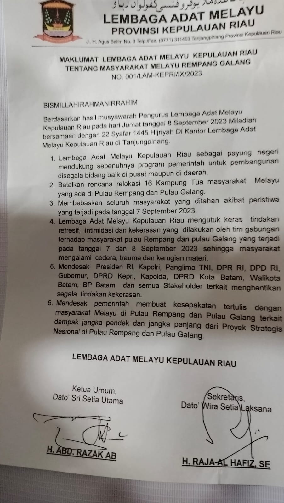 6. Mendesak pemerintah membuat kesepakatan tertulis dengan masyarakat Melayu di Pulau Rempang dan Pulau Galang terkait dampak jangka pendek dan jangka panjang dari Proyek Strategis Nasional di Pulau Rempang dan Pulau Galang.