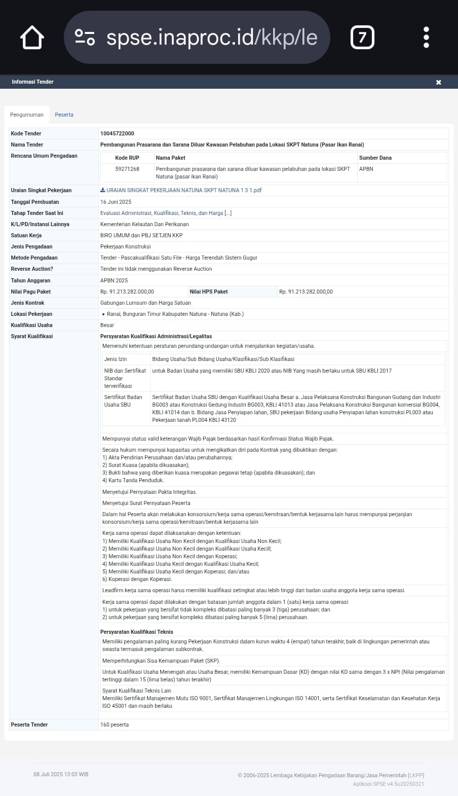 Diketahui melalui laman lpse.kkp.go.id dengan nama tender pembangunan prasarana dan sarana diluar kawasan pelabuhan pada lokasi SKPT natuna ( pasar ikan ranai ) dengan nilai pagu anggaran Rp.91.213.282.000 dengan total peserta lelang mencapai 160 peserta.