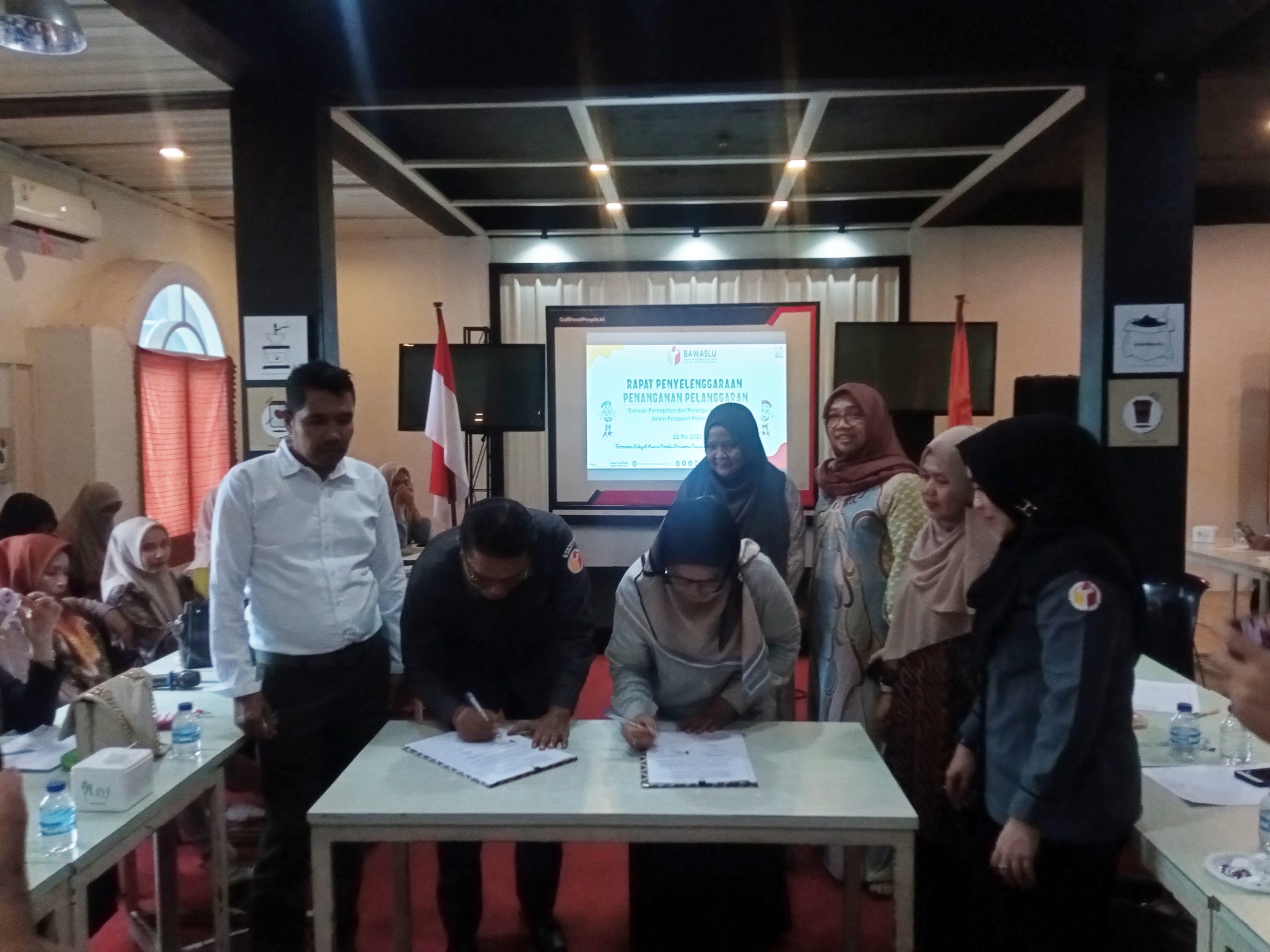 Prosesi penanda tanganan yang berlangsung di Stasion Coffee Kota Lhokseumawe tersebut dilakukan Ketua Panwaslih Kota Lhokseumawe, Teuku Zulkarnaen, didampingi Anggota Panwaslih, Sofhia Annisa, Dedy Syahputra, bersama Ketua Dewan Balai Syura Kota Lhokseumawe.