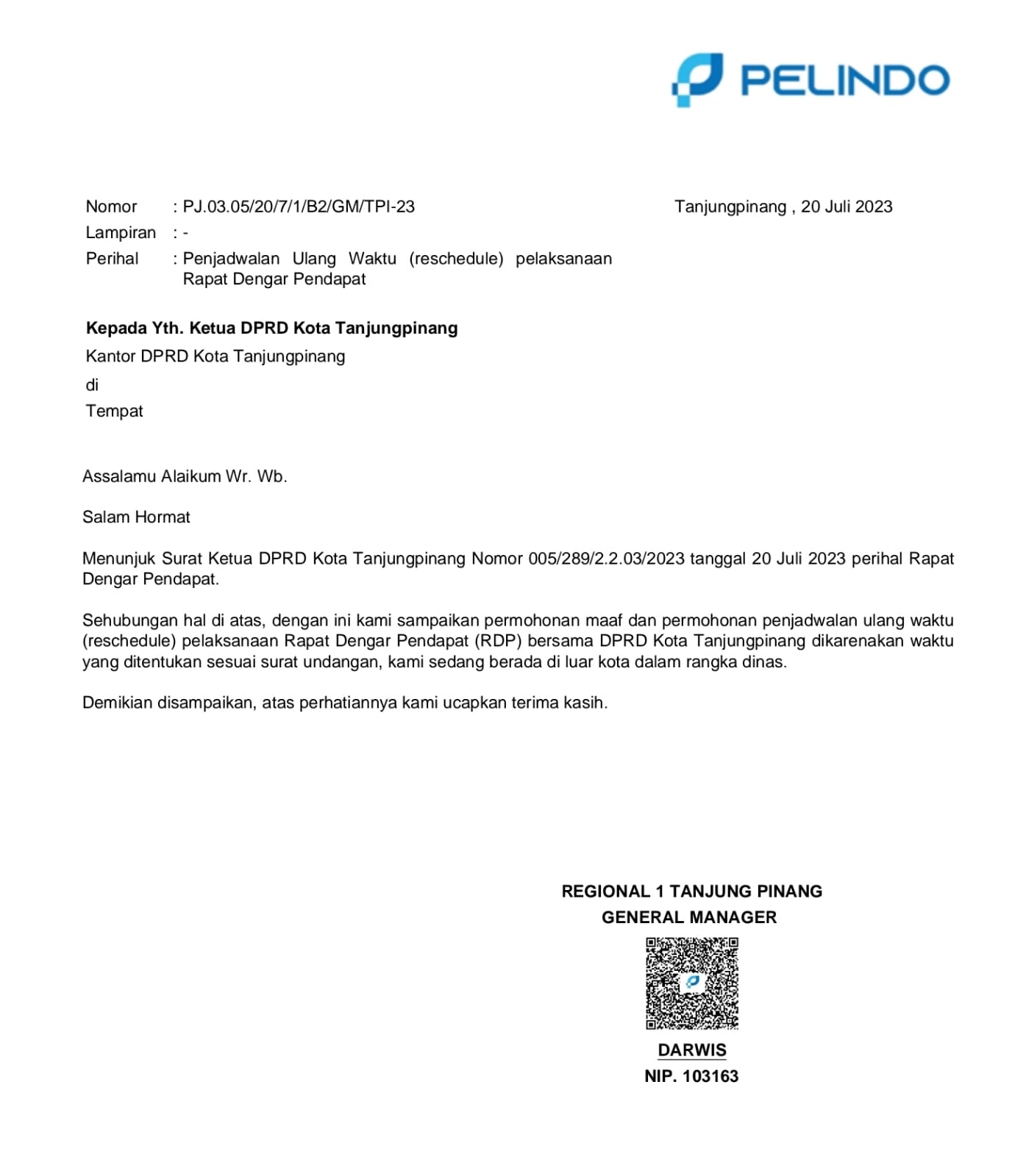 Surat tersebut tertanggal 20 Juli 2023, ditandatangani oleh General Manager Regional 1 Tanjungpinang, Darwis.