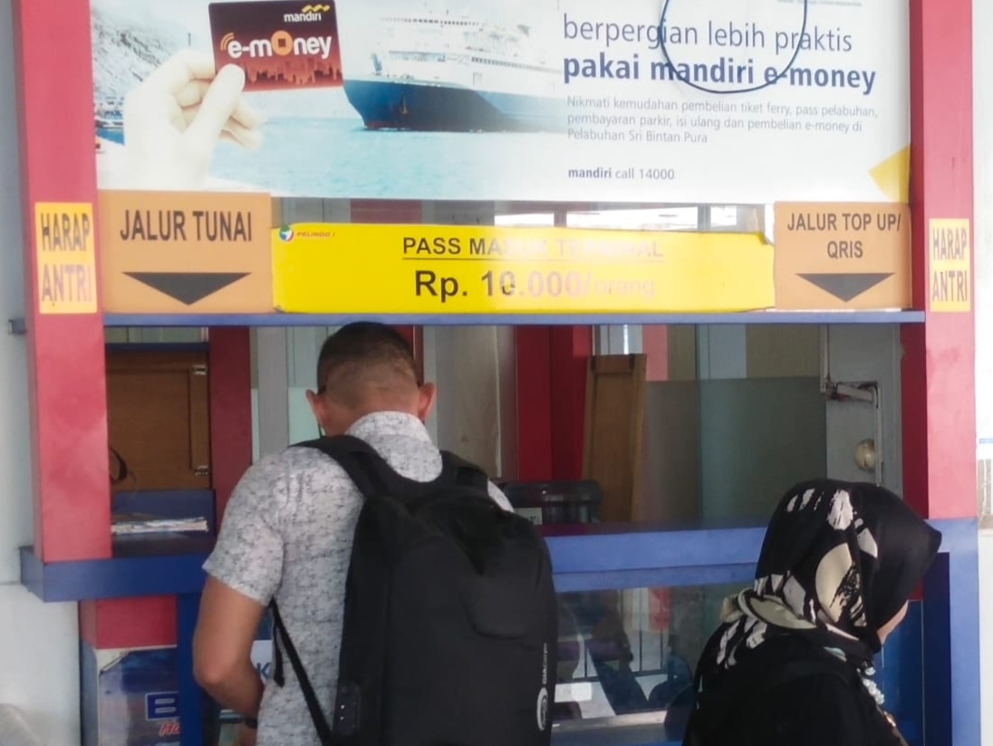 Calon penumpang terlihat membeli pass masuk pelabuhan di Sri Bintan Pura Tanjungpinang.