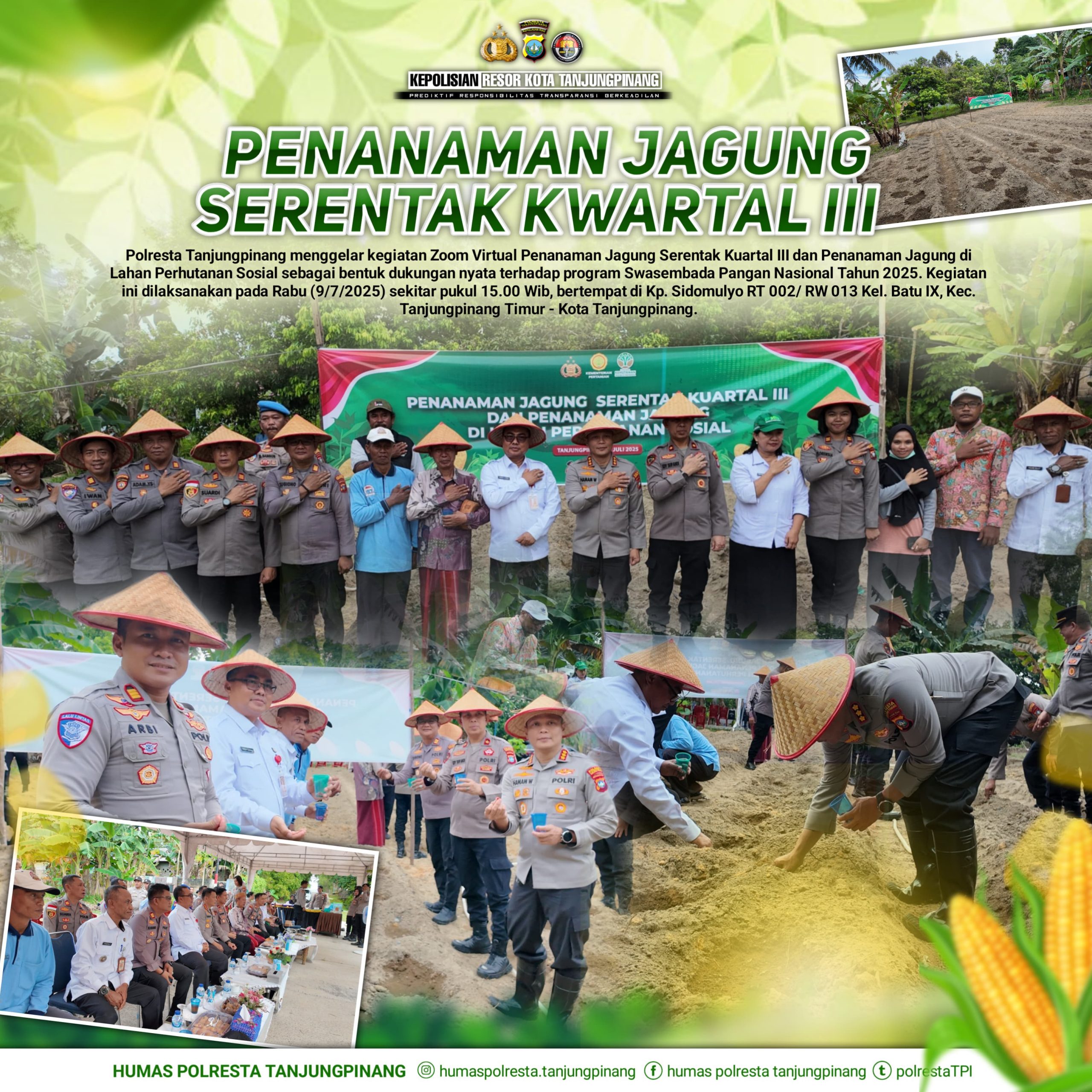 Secara nasional, program penanaman jagung kuartal III menargetkan produksi hingga 15 juta ton, dan Polresta Tanjungpinang berkomitmen memberikan kontribusi nyata terhadap capaian tersebut.