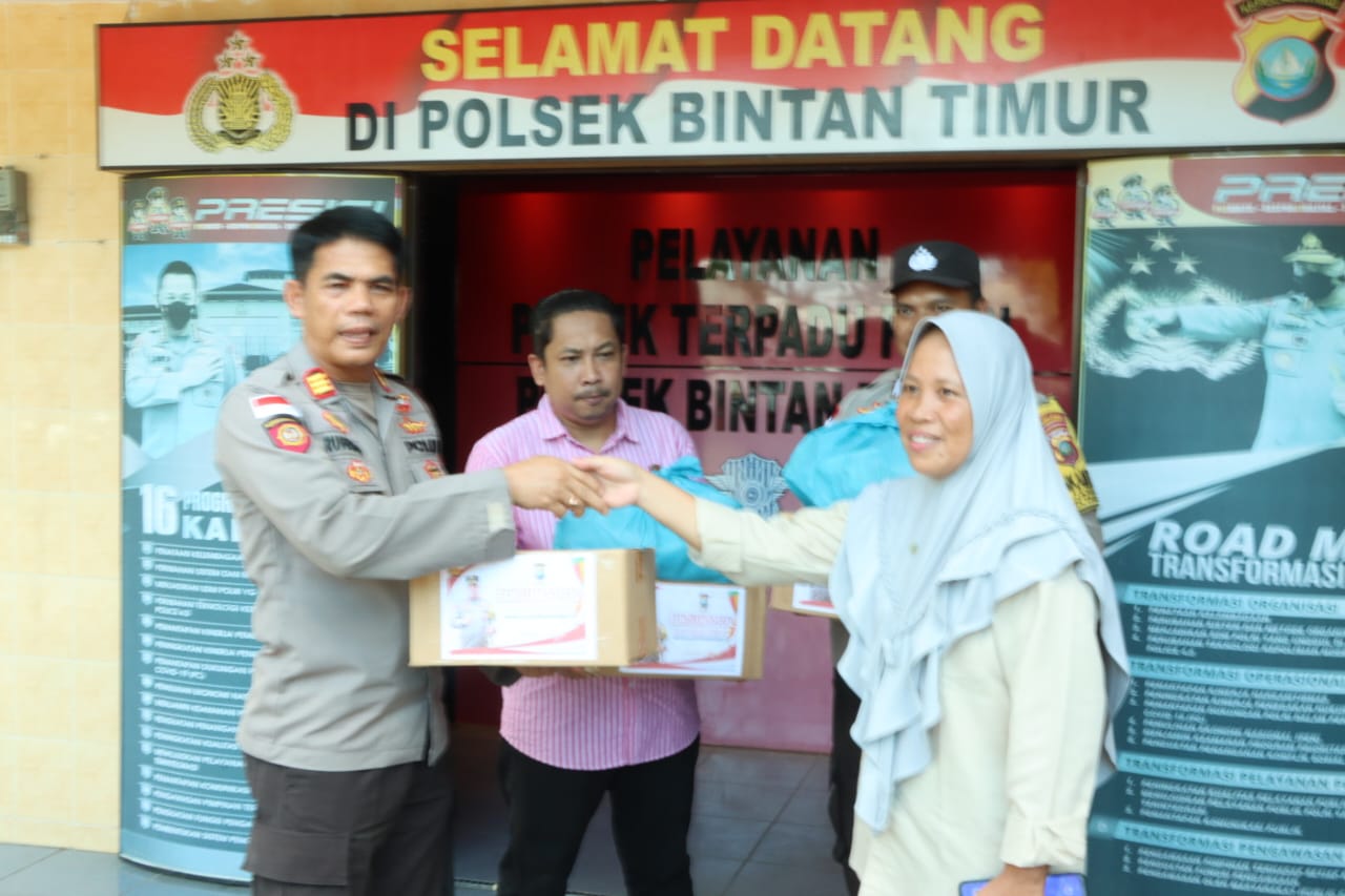 Kiri, Kapolsek Bintan Timur AKP Rugianto saat menyerahkan bantuan paket sembako