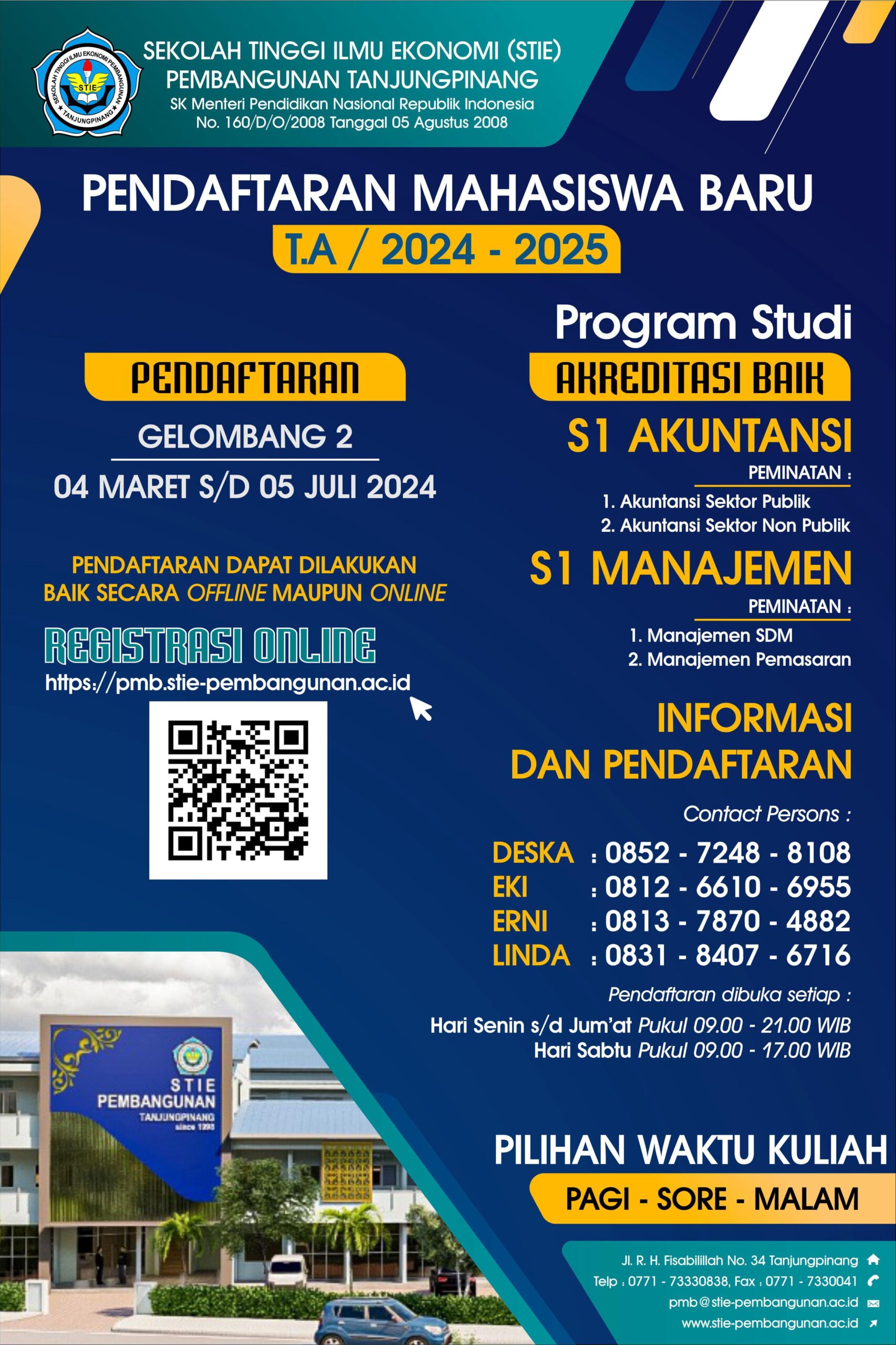 Infotoday.id. Tanjungpinang. Sekolah Tinggi Ilmu Ekonomi (STIE) Pembangunan, Tanjungpinang yang ber alamat di Jalan R. H. Fisabilillah, Kota Tanjungpinang membuka pendaftaran Tahun Akademik 2024-2025. Kali ini merupakan gelombang ke dua, setelah sebelumnya gelombang pertama sukses dilaksanakan.